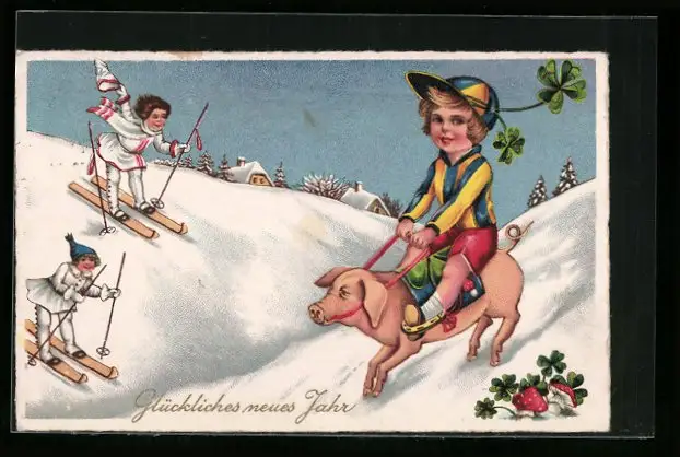 Künstler-AK Junge auf Schwein, Kinder auf Skiern zu Neujahr