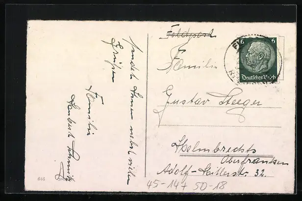 Personenbezogene Daten auf der Rückseite der Karte wurden durch blauen Textmarker unkenntlich gemacht. Die blauen Stellen sind auf die Vorderseite durchgeweicht und wirken sich negativ auf das Postkartenfoto aus