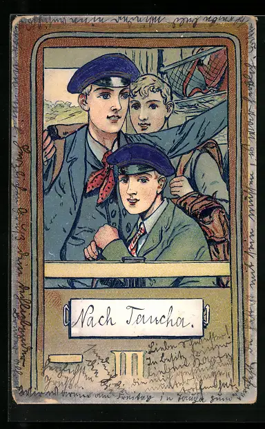 Künstler-AK Jungen in einem Eisenbahnwaggon