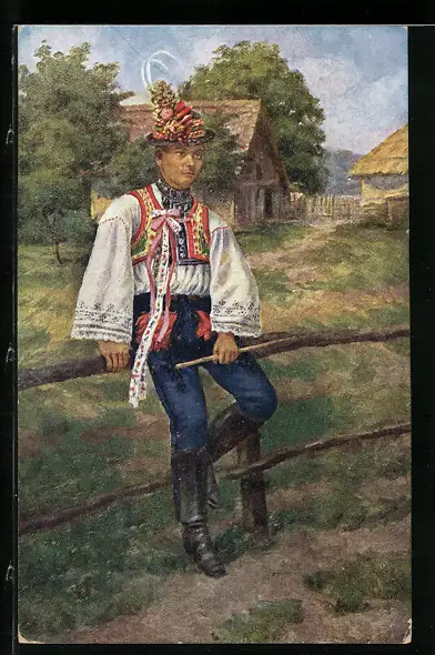 Künstler-AK Junger Mann in tschechischer Tracht sitzt auf einem Zaun