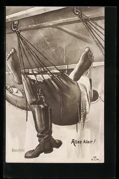 Künstler-AK K. Blossfeld: Alles klar!, Soldaten schlafen in Hängematten