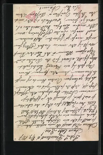Personenbezogene Daten auf der Rückseite der Karte wurden durch blauen Textmarker unkenntlich gemacht. Die blauen Stellen sind auf die Vorderseite durchgeweicht und wirken sich negativ auf das Postkartenfoto aus