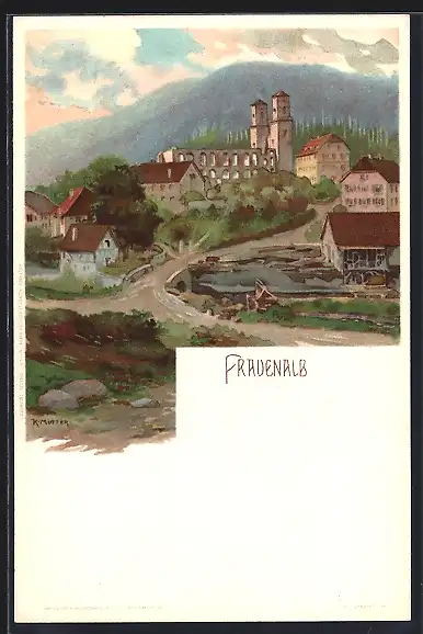 Künstler-AK K. Mutter: Frauenalb, Blick auf den Ort, Strassenpartie