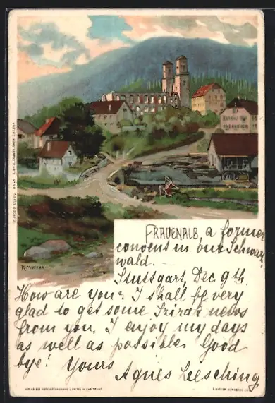 Künstler-AK K. Mutter: Frauenalb, Blick zum Ort mit Kirche