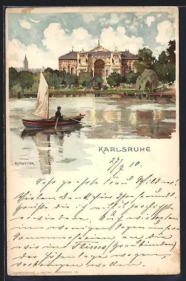 Künstler-AK K. Mutter: Karlsruhe, Mann im Segelboot