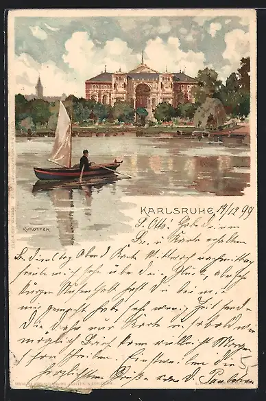 Künstler-AK K. Mutter: Karlsruhe, Mann in einem kleinen Boot auf dem See