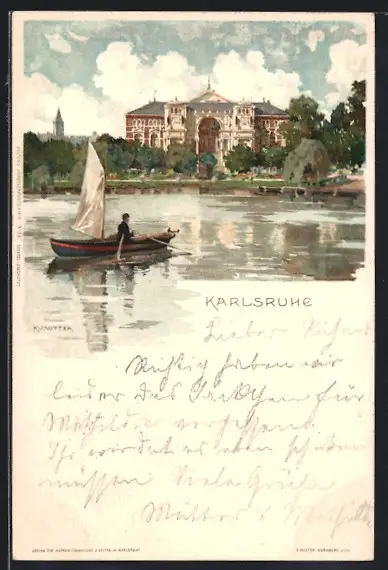 Künstler-AK K. Mutter: Karlsruhe, Ruderboot mit Blick zum Gebäude um 1900