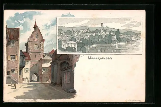 Künstler-AK K. Mutter: Überlingen, Ortspartie mit Tor, Totalansicht