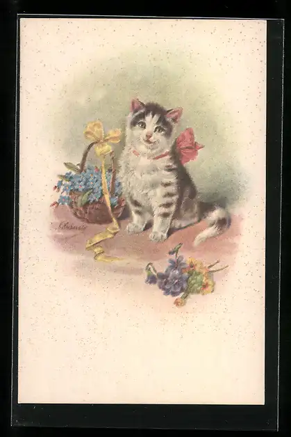 Künstler-AK Kätzchen neben einem Korb Vergissmeinnicht