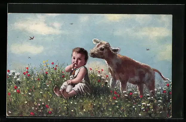 Künstler-AK Kalb mit kleinem Kind auf einer Blumenwiese