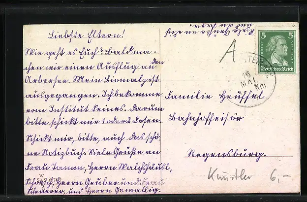 Personenbezogene Daten auf der Rückseite der Karte wurden durch blauen Textmarker unkenntlich gemacht. Die blauen Stellen sind auf die Vorderseite durchgeweicht und wirken sich negativ auf das Postkartenfoto aus
