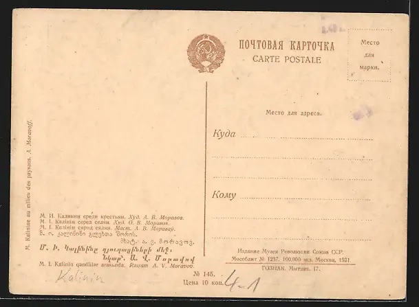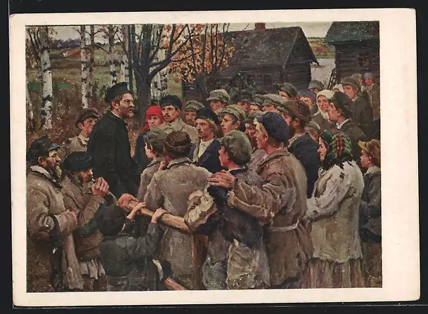 Künstler-AK Kalinin spricht zur Bevölkerung eines Dorfes