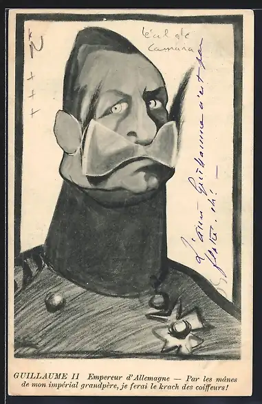 Künstler-AK Karikatur von Kaiser Wilhelm II. mit Bartbinde