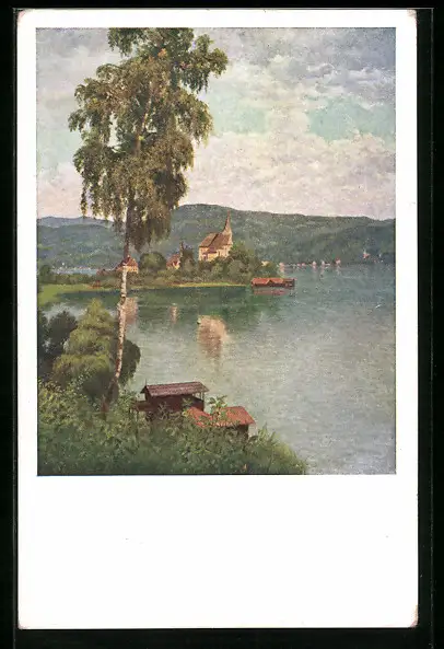 Künstler-AK Karl Maria Schuster: Maria Wörth, Uferpartie mit Kirche