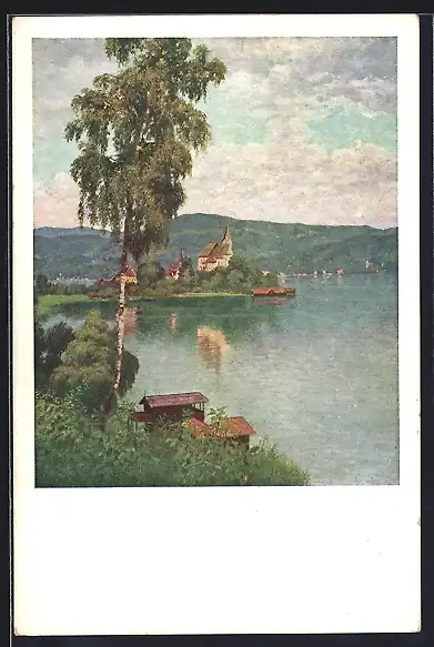 Künstler-AK Karl Maria Schuster: Maria Wörth, Uferpartie mit Kirche