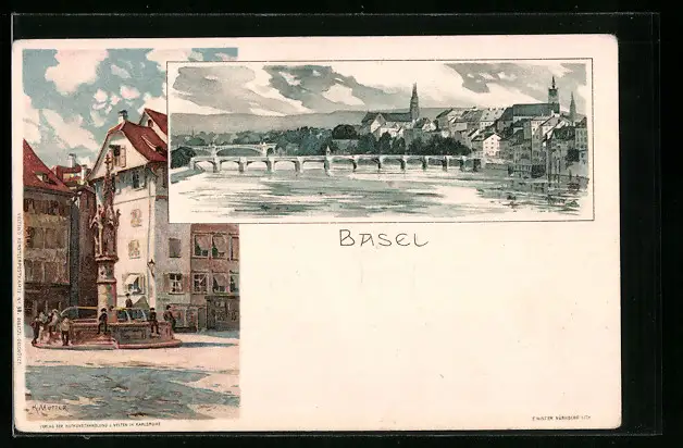 Künstler-AK Karl Mutter: Basel, Ortsansicht, Springbrunnen
