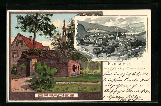 Künstler-AK Karl Mutter: Herrenalb, Teilansicht, Paradies, Bahnpost