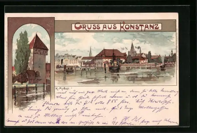Künstler-AK Karl Mutter: Konstanz, Panorama, Uferpartie mit Turm