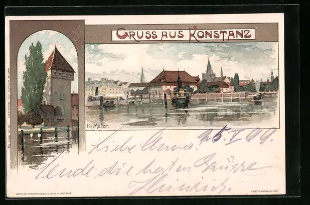 Künstler-AK Karl Mutter: Konstanz, Uferpartie vom Wasser aus, Turm