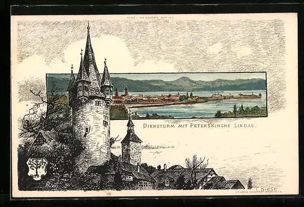 Künstler-AK Karl Mutter: Lindau / Bodensee, Diebsturm mit Peterskirche, Teilansicht