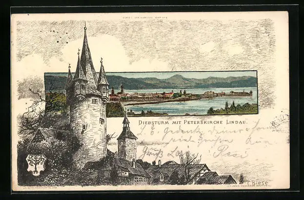 Künstler-AK Karl Mutter: Lindau, Diebsturm mit Peterskirche, Teilansicht