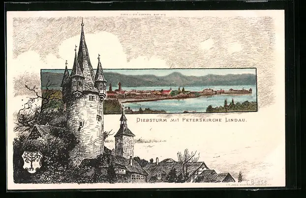 Künstler-AK Karl Mutter: Lindau, Diebsturm mit Peterskirche, Teilansicht