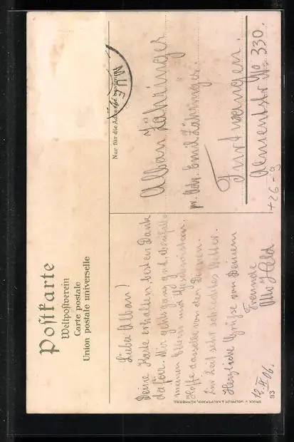 alte Ansichtskarte, gelaufen 1906, Briefmarke entfernt, rückseitig Oberflächenschaden, Stempelspur, Einriss re. oben, guter Zustand