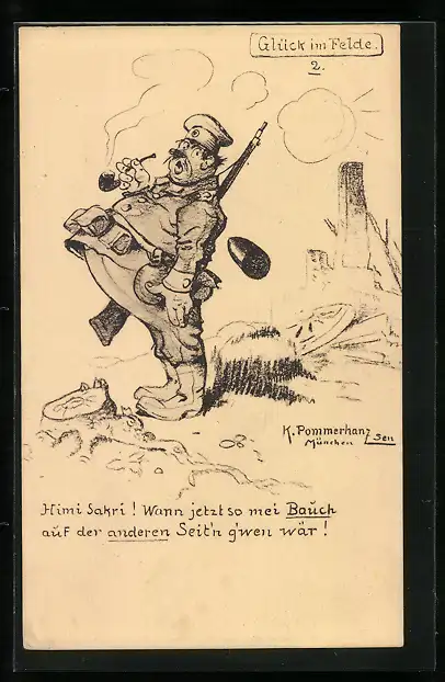 Künstler-AK Karl Pommerhanz: Dicker Soldat wird knapp von einer Granate verfehlt