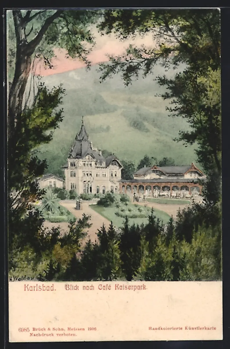 Künstler-AK Karlsbad, Blick nach Cafe Kaiserpark