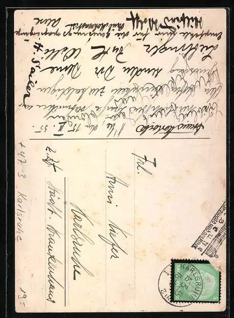 Personenbezogene Daten auf der Rückseite der Karte wurden durch blauen Textmarker unkenntlich gemacht. Die blauen Stellen sind auf die Vorderseite durchgeweicht und wirken sich negativ auf das Postkartenfoto aus