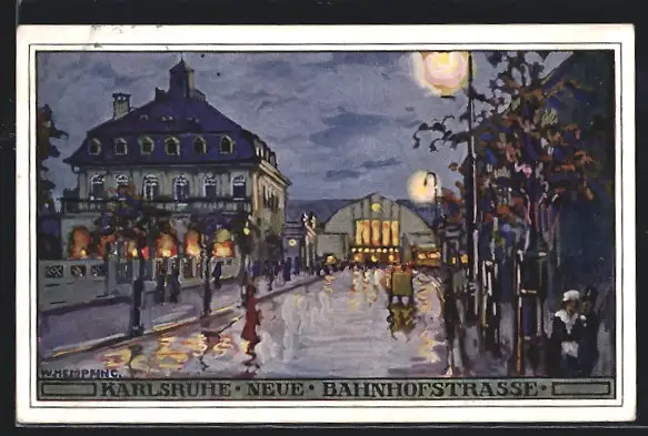 Künstler-AK Karlsruhe i. B., Passanten in der neuen Bahnhofstrasse