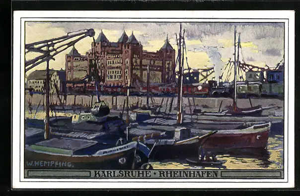 Künstler-AK Karlsruhe i. B., Schiffe im Rheinhafen