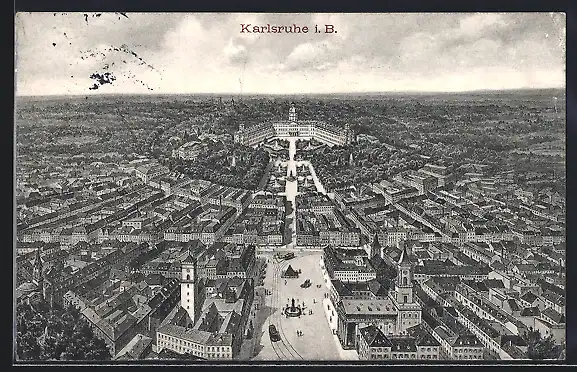 Künstler-AK Karlsruhe i. B., Schloss und Strassenpartie mit Strassenbahn