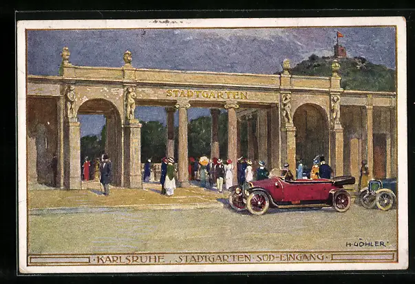 Künstler-AK Karlsruhe i. B., Süd-Eingang zum Stadtgarten
