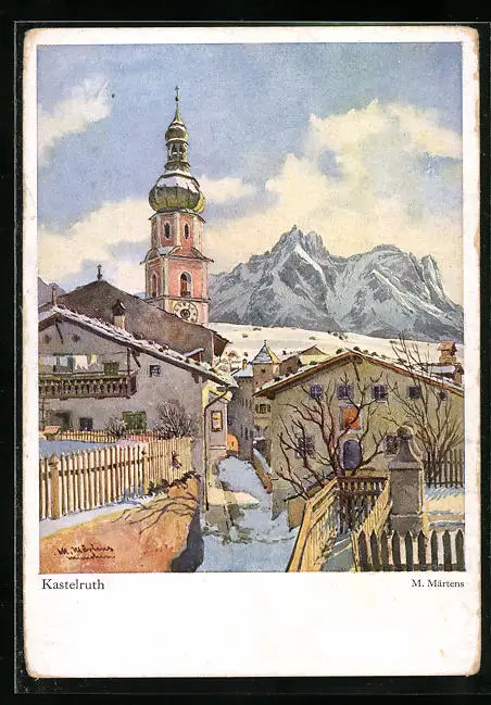 Künstler-AK Kastelruth, Teilansicht mit Kirche im Winter