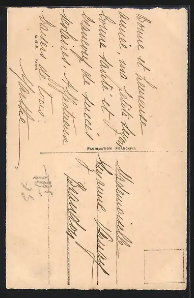 Personenbezogene Daten auf der Rückseite der Karte wurden durch blauen Textmarker unkenntlich gemacht. Die blauen Stellen sind auf die Vorderseite durchgeweicht und wirken sich negativ auf das Postkartenfoto aus