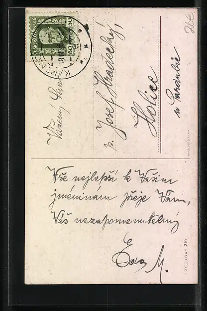 Personenbezogene Daten auf der Rückseite der Karte wurden durch blauen Textmarker unkenntlich gemacht. Die blauen Stellen sind auf die Vorderseite durchgeweicht und wirken sich negativ auf das Postkartenfoto aus