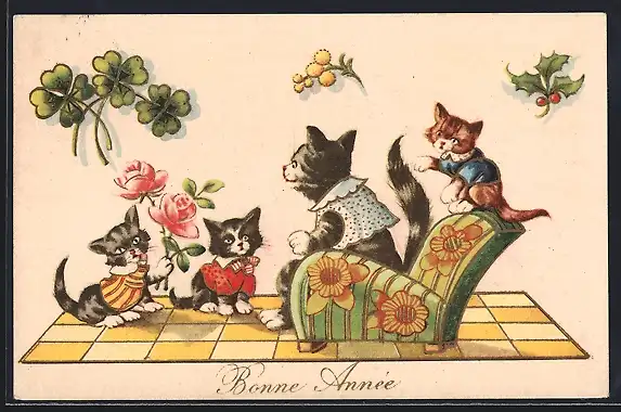 Künstler-AK Katzenmutter bekommt von ihren Kindern Rosen geschenkt