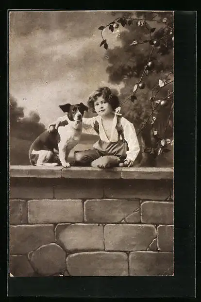Künstler-AK Kind mit Terrier auf einer Mauer
