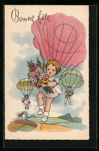 Künstler-AK Kinder als Fallschirmspringer mit Blumen