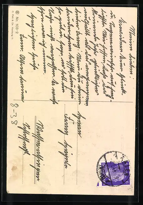 Personenbezogene Daten auf der Rückseite der Karte wurden durch blauen Textmarker unkenntlich gemacht. Die blauen Stellen sind auf die Vorderseite durchgeweicht und wirken sich negativ auf das Postkartenfoto aus