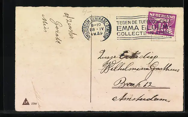 Personenbezogene Daten auf der Rückseite der Karte wurden durch blauen Textmarker unkenntlich gemacht. Die blauen Stellen sind auf die Vorderseite durchgeweicht und wirken sich negativ auf das Postkartenfoto aus