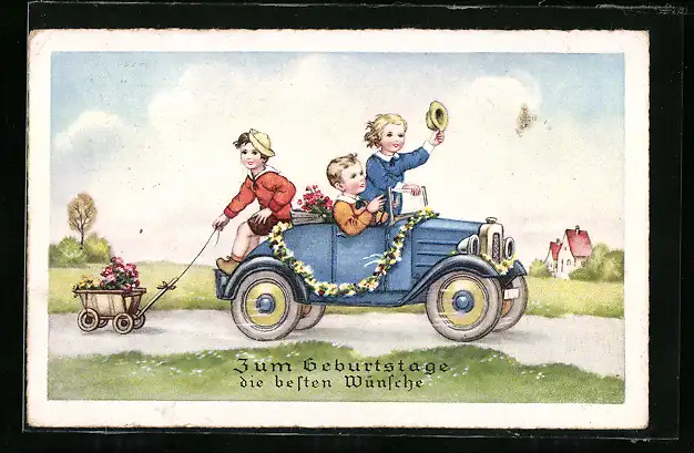 Künstler-AK Kinder in einem blumengeschmückten Auto