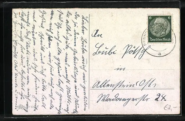 Personenbezogene Daten auf der Rückseite der Karte wurden durch blauen Textmarker unkenntlich gemacht. Die blauen Stellen sind auf die Vorderseite durchgeweicht und wirken sich negativ auf das Postkartenfoto aus