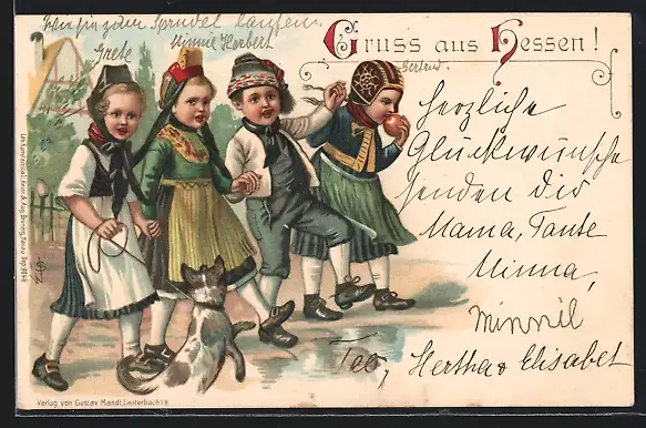 Künstler-AK Kinder in hessischer Tracht mit Hund