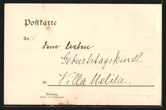 Personenbezogene Daten auf der Rückseite der Karte wurden durch blauen Textmarker unkenntlich gemacht. Die blauen Stellen sind auf die Vorderseite durchgeweicht und wirken sich negativ auf das Postkartenfoto aus