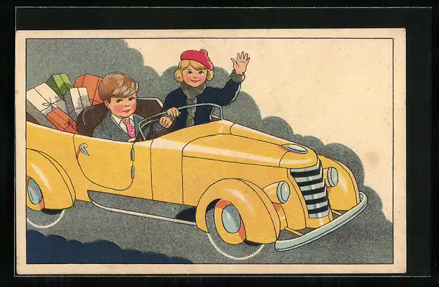 Künstler-AK Kinder mit Geschenken in einem Auto