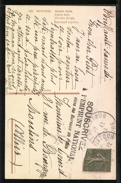 Personenbezogene Daten auf der Rückseite der Karte wurden durch blauen Textmarker unkenntlich gemacht. Die blauen Stellen sind auf die Vorderseite durchgeweicht und wirken sich negativ auf das Postkartenfoto aus