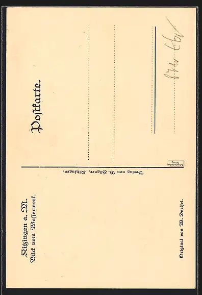 Personenbezogene Daten auf der Rückseite der Karte wurden durch blauen Textmarker unkenntlich gemacht. Die blauen Stellen sind auf die Vorderseite durchgeweicht und wirken sich negativ auf das Postkartenfoto aus
