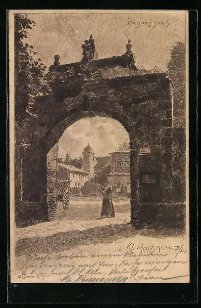 Künstler-AK Klein Machnow, Eingang zum Gut